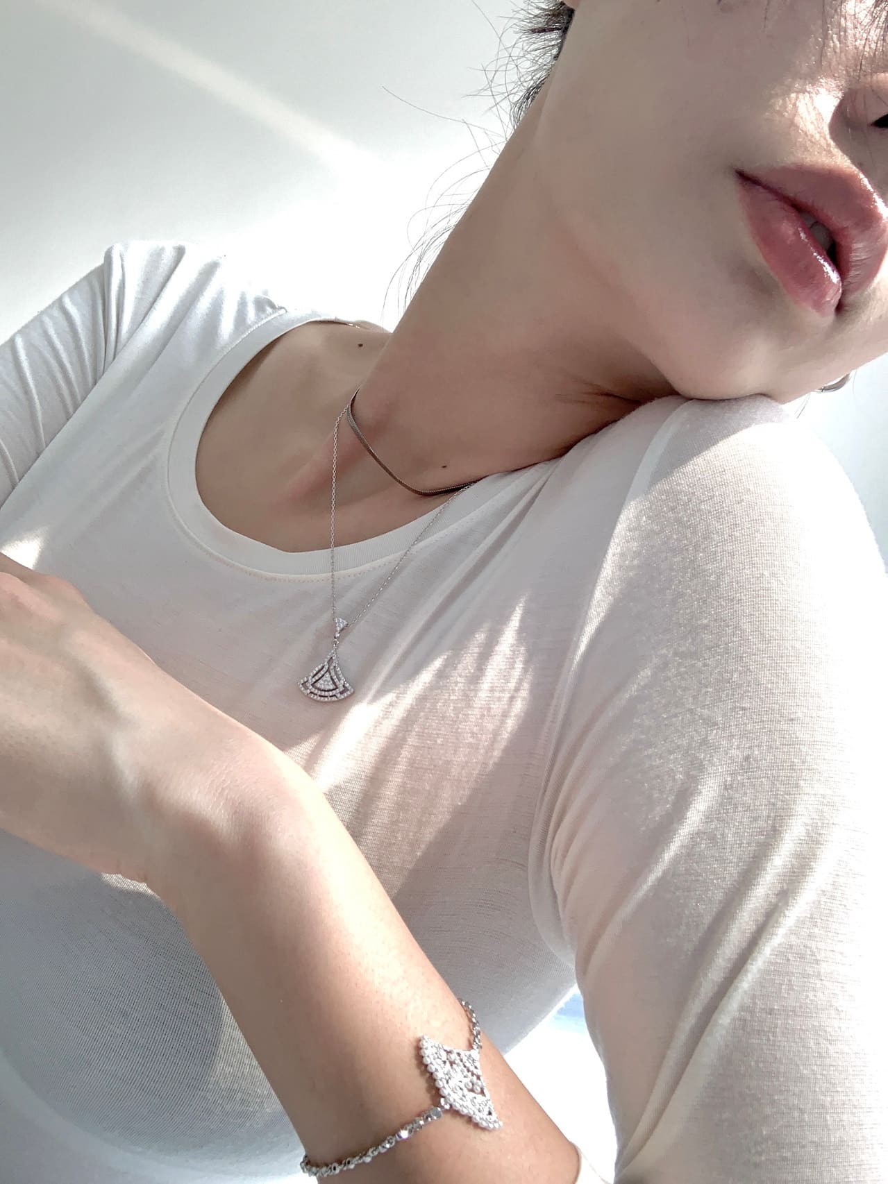 郑爽以手轻托下颚,眼神清澈直视镜头,展现自信从容的优雅姿态
