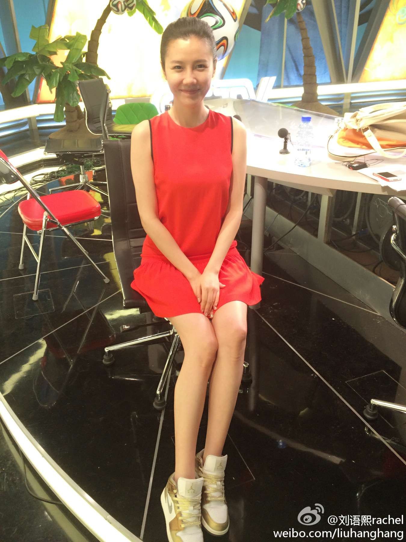 刘语熙优雅翘腿而坐,黑色丝袜与高跟鞋展现修长腿部线条
